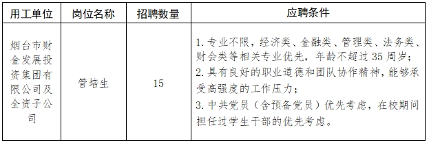 備注:市外首次來煙就業(yè)的35周歲以下(特別優(yōu)秀的年齡可適當放寬)非應屆畢業(yè)生,如有應聘意向,可先通過管培生崗位應聘,如符合煙臺市人才引進政策,且順利通過集團招聘考核,將根據應聘人員工作履歷情況,結合集團實際用工需求,主要分配到投資管理、融資租賃、保理、綜合文秘、運營管理等工作崗位。